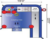 | 7 in 1 Combo Bounce House Rentals Includes 2 basketball hoops, horizontal obstacles, vertical pop-up obstacles, Slide, Climbing Wall, and Jumping Area. 22'L x 19'W x 15'H Click on picture to order and view detailed images. |